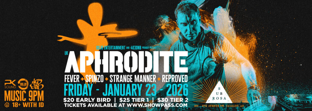 Join us on Friday, January 23, as Dojo Entertainment & 403DNB proudly present APHRODITE for a night of high-energy music, with support from Fever, Spinzo, Strange Manner, and Reproved. Music runs from 9:00 PM until late.