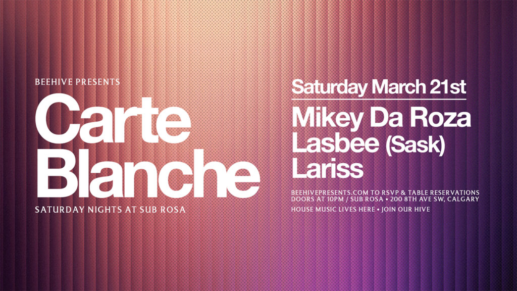 Join us Sat, Mar 21 for Carte Blanche as we welcome back Mikey Da Roza, Lasbee (Saskatoon), and Lariss. Free entry before 11 PM with RSVP!