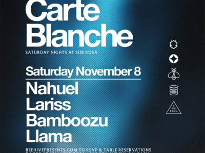 Join us Sat, Nov 8 for a Carte Blanche as we welcome Nahuel, Lariss, Bamboozu and Llama— always free with RSVP. Doors open at 9pm.