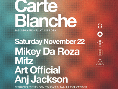 Carte Blanche — Saturday, November 22 Get ready for a night of pure house energy with Mikey Da Roza, Mitz, Art Official, and Anj Jackson behind the decks.